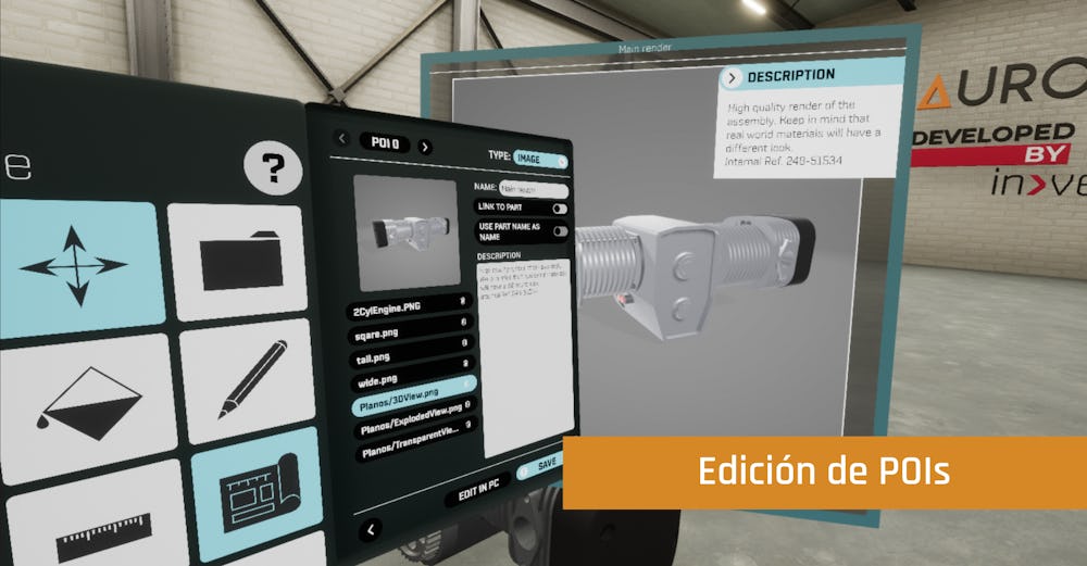 Hemos sustituido la funcionalidad "Mostrar planos" por "POI". Los POIs son puntos de interés que podemos anclar a los modelos para mostrar recursos adicionales, ya sean imágenes, vídeos o documentos.